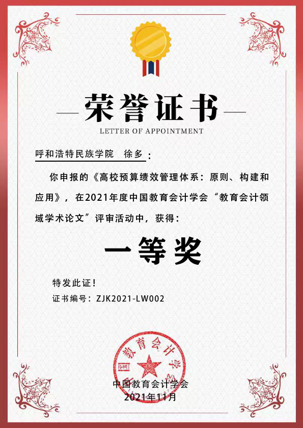 由中国教育会计学会举行的2021年“教育会计领域学术论文”征文运动评选效果日前揭晓,,,,,,我校财务处后勤财务治理科科长徐多的论文《高校预算绩效治理系统:原则、构建和应用》荣获一等奖。 。。。。 。。