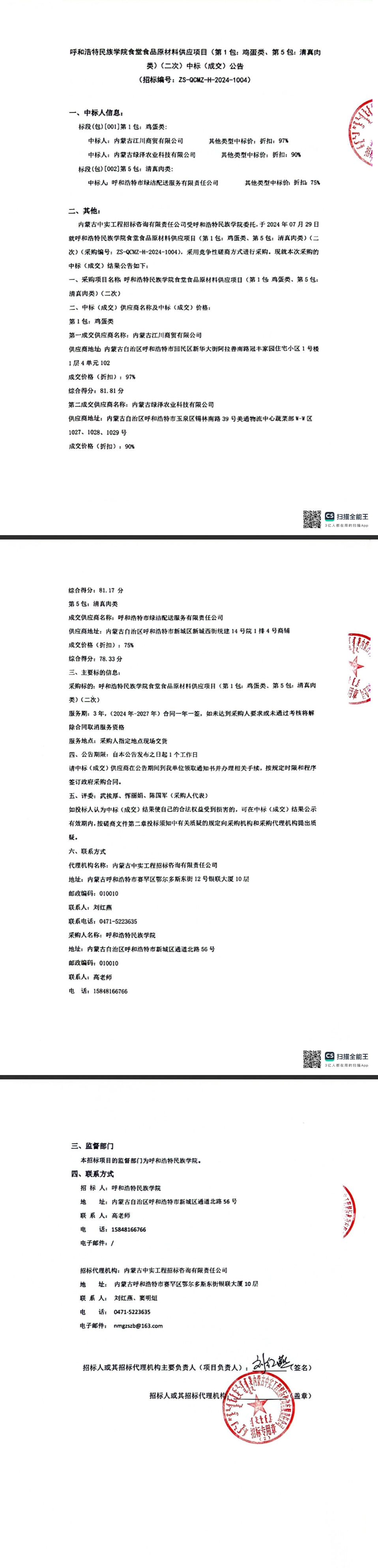 胜天国际官网食堂食物原质料供应项目(第1包:鸡蛋类、第5包:清真肉类)(二次)中标(成交)通告