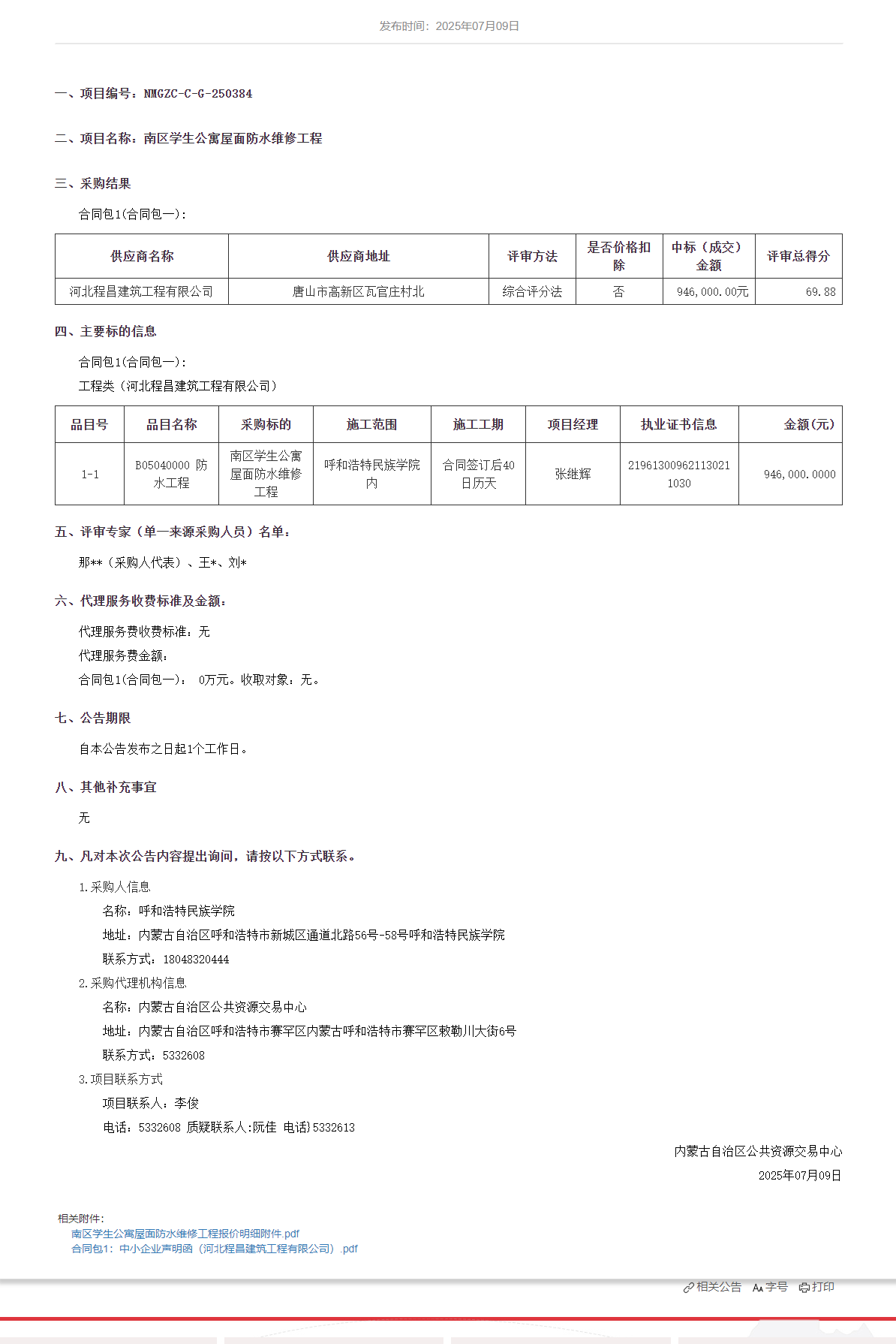 胜天国际官网南区学生公寓屋面防水维修工程中标(成交)效果通告
