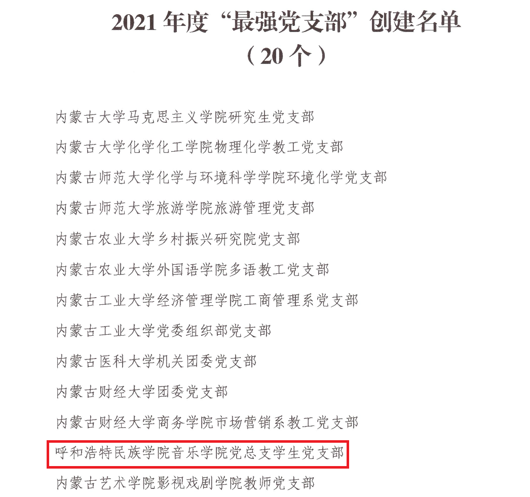 克日,,,,,,,,自治区党委教育工委宣布了2021年度“最强党支部”建设名单,,,,,,,,我校音乐学院学生党支部榜上著名。。。。。。。这是继数学与大数据学院黄大年式西席团队党支部、化学与情形学院教工第二党支部入选2020年度自治区党委教育工委“最强党支部”建设名单之后,,,,,,,,我校唬唬唬O虏愕匙橹俅位翊松称呼。。。。。。。