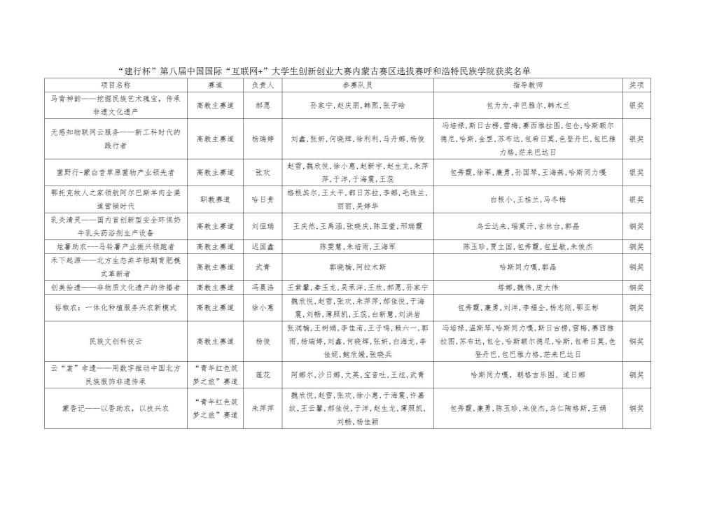 第八届中国国际“互联网+”大学生立异创业大赛内蒙古赛区选拔赛总决赛于8月11日下昼圆满落幕。。。。。8月15日自治区教育厅宣布《关于“建行杯”第八届中国国际“互联网+”大学生立异创业大赛区选拔赛评审效果的公示》,,,,,,,,我校唬唬;;;;竦酶呓讨魅3银6铜、职教赛道1银、青年红色筑梦之旅赛道2铜以及青年红色筑梦之旅赛道优异组织奖。。。。。在奖牌总数上创我校在该赛事上的历史最好效果。。。。。