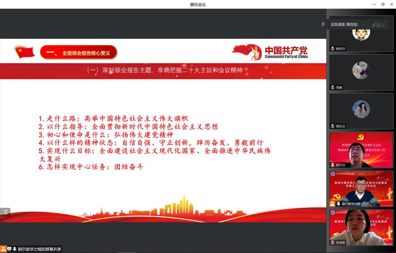 1月9日,,,,, ,新闻传媒学院召开党员大会,,,,, ,校党委委员、组织部部长吴阿古拉以《学习党的二十大精神 强化党员使命继续》为题讲党课,,,,, ,宣讲党的二十大精神 。。。 。。。。新闻传媒学院党总支书记额尔敦毕力格主持聚会 。。。 。。。。