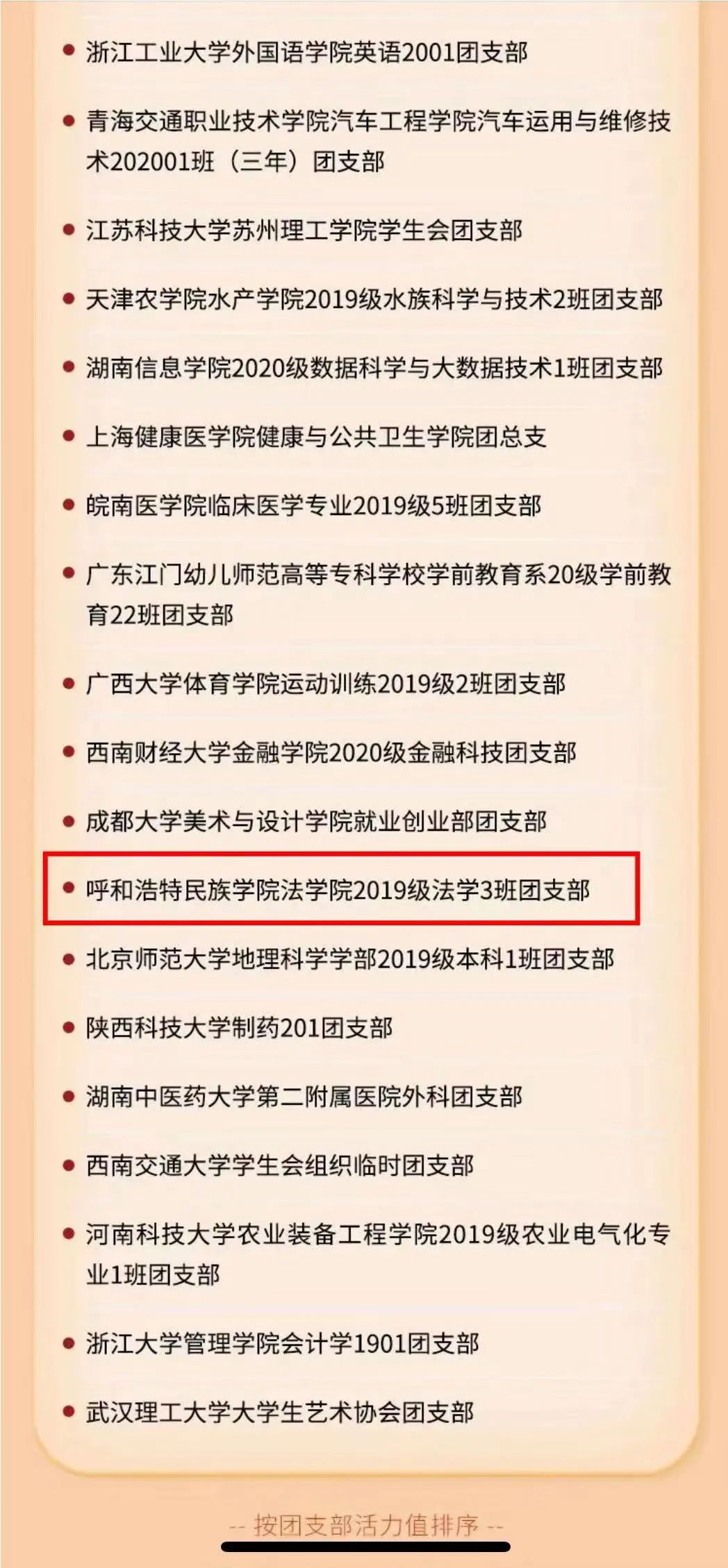 克日,,,, ,,,,2022年度天下高校“活力团支部”风范展示TOP100榜揭晓,,,, ,,,,我校法学院2019级法学3班团支部入围天下高校“活力团支部”最具效劳力TOP100榜。。。。。