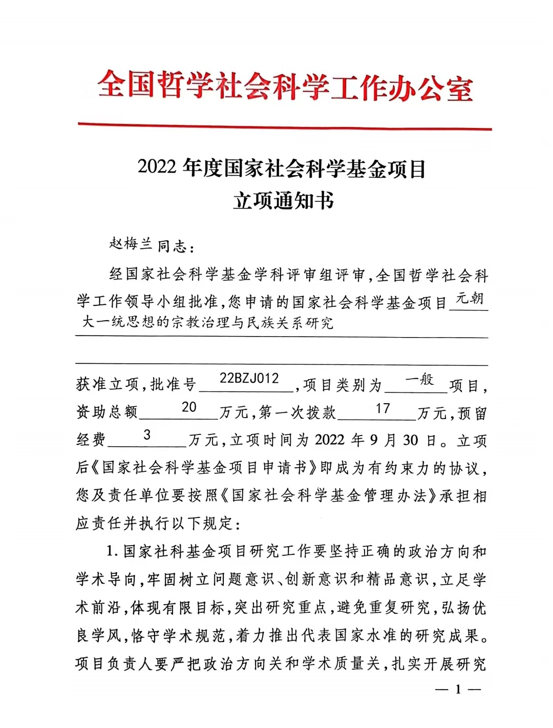 近期国家社科基金2022年度项目评审效果公示,,,,,,,,我院赵梅兰博士申报的“元朝大一统头脑的宗教治理与胜天国际官网关系研究”获准立项为2022年度一样平常项目,,,,,,,,获批资助科研经费20万元。。。 。。