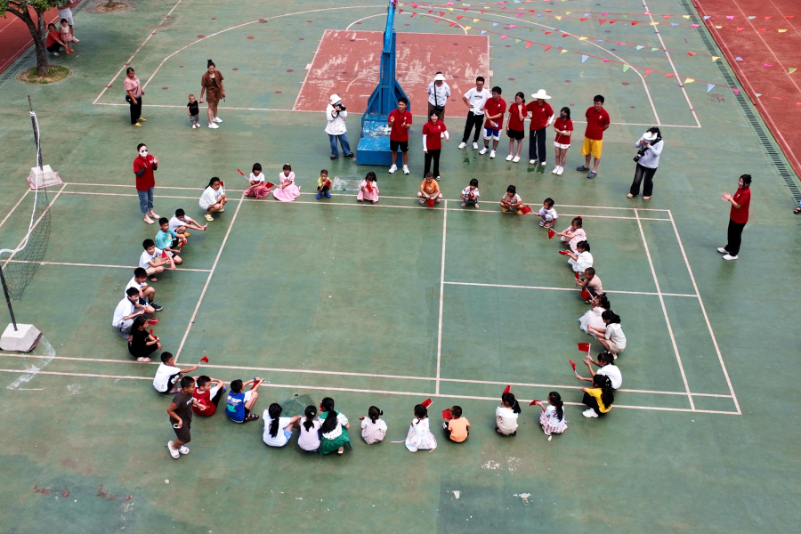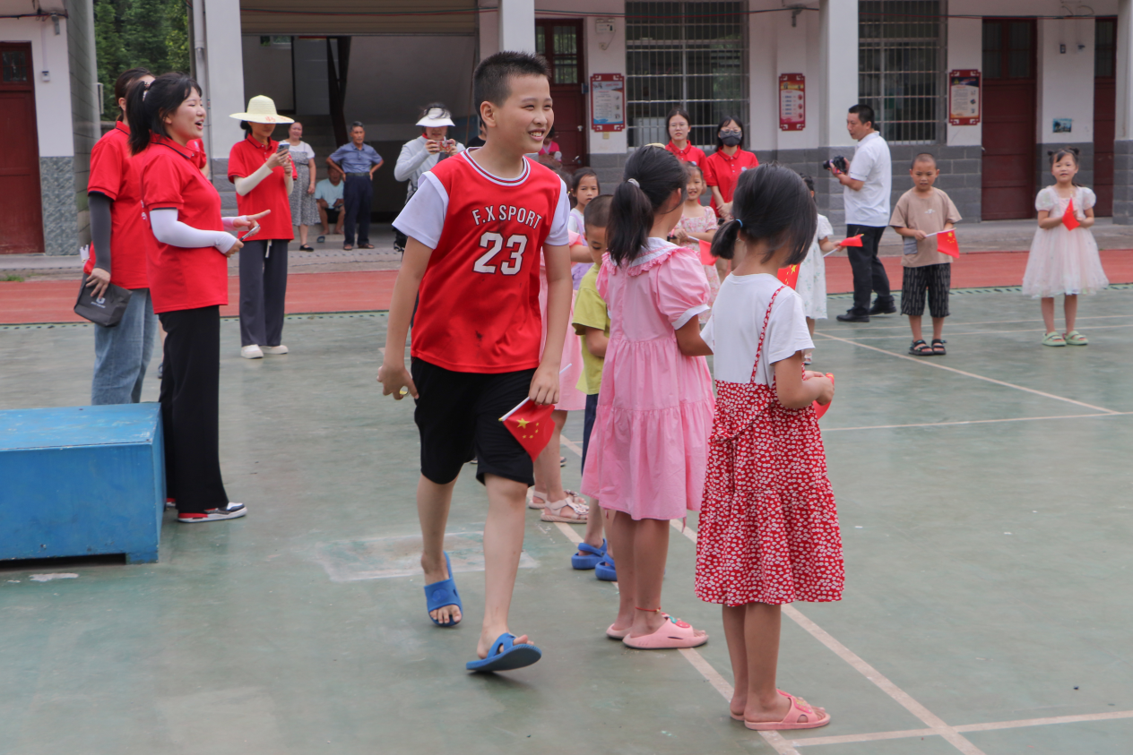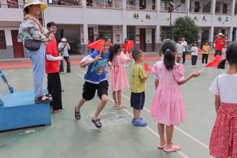 随后,志愿者们组织学生进行户外游戏,在蓝蓝的天空下,伴随着“丢呀丢呀丢手卷,轻轻地放在小朋友的手边......”的愉悦歌声,小朋友们拿着小红旗欢快地在操场上竭尽全力大声呼喊着,欢笑着,奔跑着,一张张活泼的儿童的笑脸像盛开在夏日清晨的鲜花。