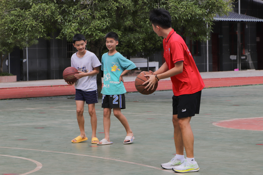 随后,教学组的陈冠带领报完名的小朋友们在操场上玩起了篮球。球场上小孩子的笑容就像夏日的花海,构成如一幅充满了童趣和生机的绘画。