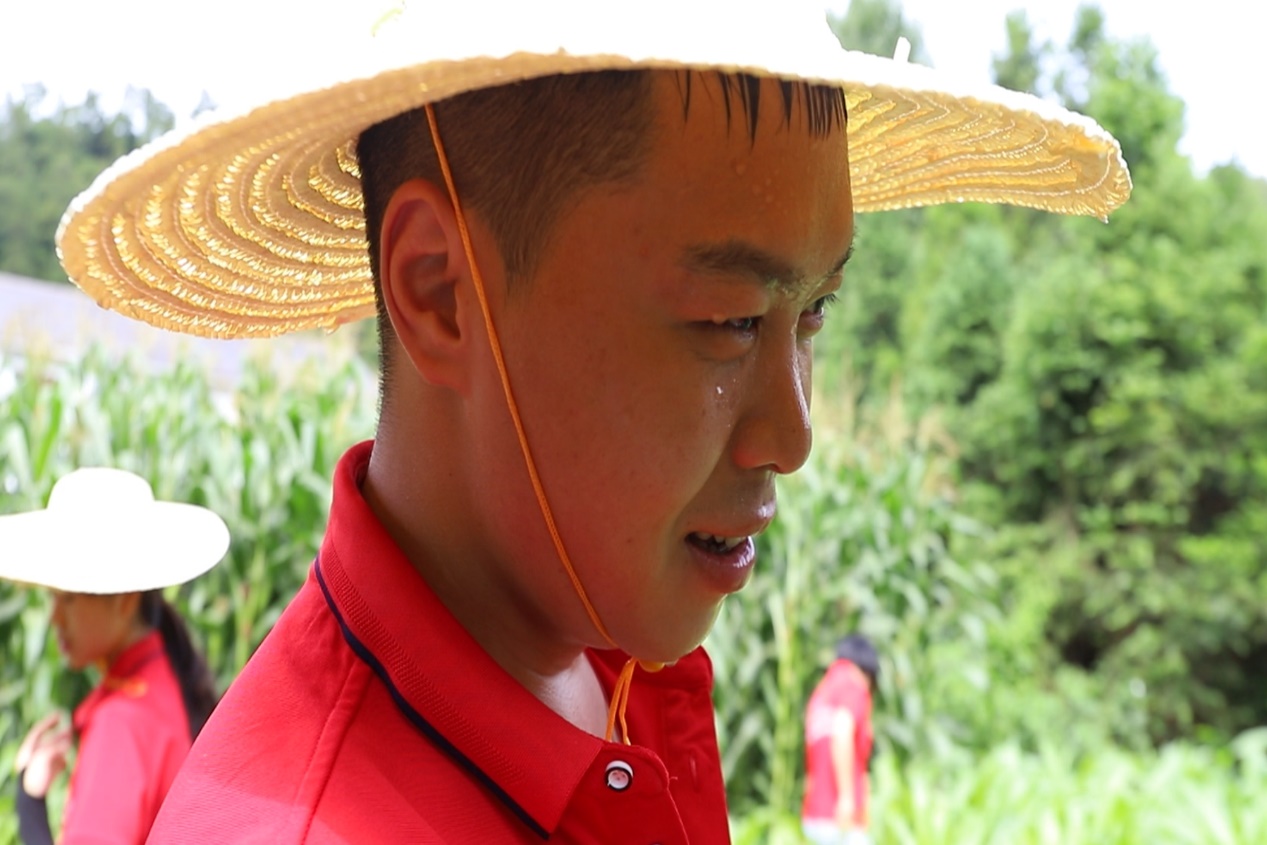 据悉,此块田地是专设为木脚完全小学的学生劳动教育基地,这些苗秆正是在校孩子们辛勤种植的成果。开元学子以务实为民的态度耕耘,助力孩子们早日丰收。实践团成员田祐臣一把甩过沿着脸颊流淌的汗水,“我们开展田地除草垦地不仅让尚且稚嫩的玉米苗茁壮成长,更让我们自身从社会实践中学习奋斗,获得成长。”