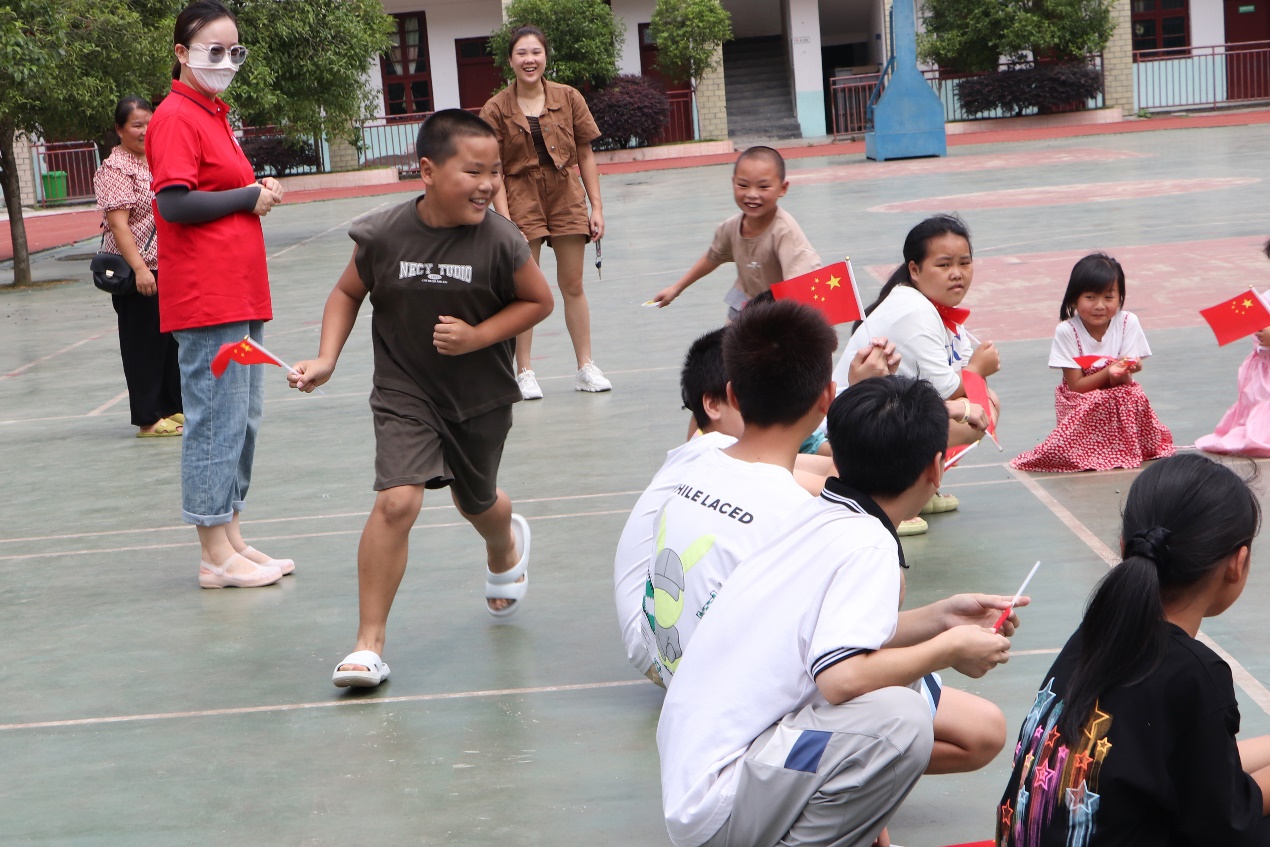 最后,为让学生们尽快熟悉环境、了解彼此,实践团在罗茜介绍了游戏规则后,带领孩子们齐聚操坪中心、围坐一圈,开展摇旗丢手绢游戏。“丢手绢”的歌声飞扬于木脚完全小学乃至周围的山谷溪涧,红旗也随孩童们的欢声笑语在他们的手中飘扬,一场场追逐战惊险刺激又妙趣横生,部分前来看望孩子的家长也笑容满面,倍感欣慰。五轮的游戏时光幸福而又短暂,许多小朋友表示非常期待接下来筑梦课堂的多样课程。