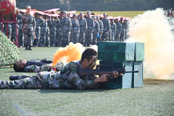 分列式表演结束后,四面鼓声有节奏的响起,主席台上一名教官摇着一面红旗发出开始的号令,本次军训汇演最大的亮点拳术表演以及战术表演相继上演。开元200名新生和其他学院200名新生共同组成的400人拳术队站在田径场正中间,挥出拳头,迈开步伐,开始了军体拳表演。拳如风、步如松,他们动作刚劲、拳脚有力、气势十足、口号浑厚响亮,一套军体拳打出了军人的气势,磅礴的架势。随着豪迈的音乐响起,烟雾弹的烟雾笼罩着田径场中部,一场由军训团教官带来的战术表演在田径场中激烈进行着,战术表演模拟了战场实景、进攻战术与战场救护等科目,现场掌声欢呼声不绝于耳。
